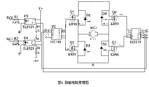 其功率開關(guān)器件采用隔離驅(qū)動方式,將多路驅(qū)動電路、控制電路、主電路互相隔離。這樣進(jìn)行設(shè)計主要是為避免引起災(zāi)難性的后果。雖然隔離驅(qū)動可分為電磁隔離和光電隔離兩種方式。由于本文所需產(chǎn)生的勵磁頻率低頻在4Hz、高頻在100Hz左右.對于光電隔離共模抑制能力差.傳輸速度慢的缺點(diǎn)不重要;同時由于光電隔離具有體積小,結(jié)構(gòu)簡單等優(yōu)點(diǎn),而且可以減少干擾,所以本裝置采用光電隔離方式。隔離元件選用TLP521光電耦(見圖2)。單片機(jī)的RC0和RC1兩引腳的PWM波形通過兩個470歐姆的電阻分別與兩個光電耦連接。當(dāng)RC0高電平到來時(RCl為底電平),與RC0相連的光電耦導(dǎo)通(與RC1相連的光電耦不導(dǎo)通)。從而通過主電路使勵磁線圈得電;同理當(dāng)RC1高電平到來時(RC0為底電平),與RC1相連的光電耦導(dǎo)通(與RC0相連的光電耦不導(dǎo)通)。從而通過主電路使勵磁線圈反向得電,這樣。周而復(fù)始。在勵磁線圈上產(chǎn)生與單片機(jī)相應(yīng)引腳上相同頻率的波形。只是幅值不一樣而已。同時.在IR2110硬件保證死區(qū)電壓時間的基礎(chǔ)上。在低頻的高電平下降沿以及低電平上升沿兩處。下位機(jī)程序中專設(shè)了延時0.01ms的死區(qū)電壓時間的程序段進(jìn)行軟件延時。目的是為了更進(jìn)一步保證功率管在工作時不會發(fā)生重疊導(dǎo)通以造成損壞。增加可靠性。死區(qū)時間示例如圖1所示。