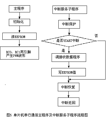 PIC16F877A單片機(jī)有USART功能用于串行通信。此處利用其異步發(fā)送和接收功能。在異步串行通信方式下,USART模塊在單片機(jī)的RX引腳上接收.在TX引腳上進(jìn)行發(fā)送:串行信息的編碼方式采用的是1位起始位、8位數(shù)據(jù)和1位停止位,可以利用來自時基振蕩器的系統(tǒng)時鐘信號,產(chǎn)生標(biāo)準(zhǔn)的波特率時鐘。當(dāng)上位機(jī)發(fā)送來的數(shù)據(jù)經(jīng)US-ART模塊采樣接收后恢復(fù)對端數(shù)據(jù)的本來面目,然后在波特率發(fā)生器提供的移位時鐘脈沖控制下,把恢復(fù)后的數(shù)據(jù)以及起始位和停止位,一步一步地移人RSR寄存器。數(shù)據(jù)移完后,再將其裝入RCREG(如果其為空的話),同時也就完成了“串行一并行”的轉(zhuǎn)換;接著將中斷標(biāo)志位RCIF置1。產(chǎn)生中斷通知CPU來讀取RCREG寄存器中的數(shù)據(jù)。在本文的程序中,就是在這樣的中斷下進(jìn)行數(shù)據(jù)的接收后將數(shù)據(jù)通過PWM程序段經(jīng)PIC16F877A單片機(jī)的RC0和RC1引腳分別送入兩個光電耦。再送入勵磁電路進(jìn)行勵磁。串行通信主程序及中斷服務(wù)程序的流程圖如圖5所示。