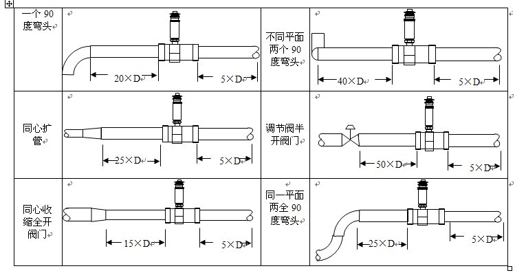 流量計(jì)可水平或垂直安裝,垂直安裝時(shí)流體流動方向應(yīng)從下向上,液體必須充滿管道,不得有氣泡;液體流動方向要與傳感器外殼上指示流向的箭頭方向一致;傳感器前后直管段要求(見圖六),上游端至少應(yīng)有10倍公稱通徑長度的直管段,下游端應(yīng)不少于5倍公稱通徑的直管段,其內(nèi)壁應(yīng)光滑清潔,無凹痕、積垢和起皮等缺陷。傳感器的管道軸心應(yīng)與相鄰管道軸心對準(zhǔn),連接密封用的墊圈不得深入管道內(nèi)腔;傳感器應(yīng)遠(yuǎn)離外界電場、磁場,必要時(shí)應(yīng)采取有效的屏蔽措施,以避免外來干擾。