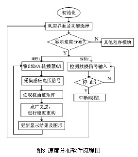 圖3展示了多電極電磁流量計(jì)重構(gòu)速度分布的流程圖,程序采用二線程并行方式,將用戶指令輸入與儀表測(cè)量、計(jì)算及顯示同步進(jìn)行,在啟動(dòng)儀表測(cè)量功能后,用戶可隨時(shí)“暫停”或“停止”,或跳轉(zhuǎn)至其他功能。
