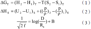 式中,下標2和1表示不同的截面,下標T表示等溫過程,下標S表示等熵過程,字母H、S、T、U、p和ρ分別分別表示過程的熱焓、熵、熱力學溫度、內能、流體壓力和密度。ΔG是過程的吉布斯自由能變化。ΔH是過程的熱焓變化。f是范寧阻力系數(shù),D是管道內徑,Ra是管壁粗糙度,B是系數(shù)。