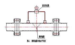 A 水平安裝時,楔形流阻應(yīng)垂直于管道底部的通流部分,以使管道中的固體顆粒能自由通過。見圖4。