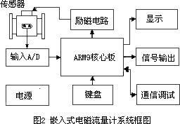 電磁流量計由測量裝置和電路兩部分組成,電路部分主要由檢測輸入模塊、勵磁輸出模塊、流量輸出模塊。圖形顯示模塊、鍵盤模塊、通信及調試接口、電源模塊、以及最重要的基于ARM9嵌入式系統(tǒng)[2]的核心板組成。圖2給出了嵌入式電磁流量計的系統(tǒng)框圖。