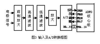 檢測輸入模塊包括差分測量放大器、低通和高通濾波器、增益放大器以及A/D轉換電路,如圖3所示。