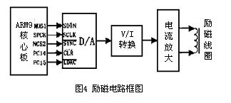 電磁流量計的勵磁電路的任務是向勵磁線圈提供一穩(wěn)定的驅動電流。電流波形為方波、三值方波和梯形波[11]等形式,波形變化的目的是結合信號處理電路,分析在不同勵磁方式下電磁流量計的精確度、零點穩(wěn)定性和抗干擾能力等多項指標。為研制高精度電磁流量計作探索性研究。該電路由核心板的SPI2口輸出數字量,經過D/A轉換形成模擬信號,經V/I轉換激勵和帶有電流負反饋的電流放大器輸出,適合各種勵磁波形的變化。結構框圖如圖4。
