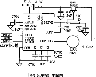 電磁流量計在實現(xiàn)測量、分析和處理的時候,除了現(xiàn)場顯示瞬時流量和累積流量以外,通常還會輸出一個標準的4~20mA電流信號。因此,該電路利用AD421轉換電路實現(xiàn)了流量輸出的功能。