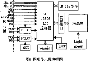 由于AT9lRM9200處理器未集成圖形顯示,核心板上也未提供,所以,要實現(xiàn)圖形顯示,必須構建圖形顯示模塊。電路采用LCD控制器SID13506顯示芯片[7]實現(xiàn)彩色液晶點陣顯示和VGA標準接口。系統(tǒng)框圖如圖6所示。