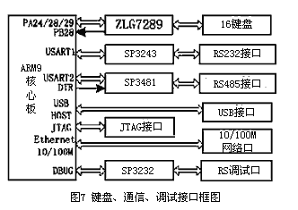 通信功能的建立主要是直接由核心板引出了10/100M的TCP/IP網絡接口,將處理器的USART1單元通過SP3243建立了RS232標準串行通信口COM1,將處理器的USART2單元通過SP3481建立了RS485標準串行通信口。