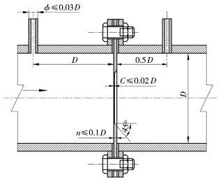 在管道里插入1個(gè)與管軸垂直的金屬板,金屬板中心為1個(gè)圓孔,孔的中心位于管道的中心線上,孔板稱為節(jié)流元件。在孔板進(jìn)氣側(cè)距離孔板1個(gè)管道直徑的位置,安裝1個(gè)測(cè)壓管;在孔板出氣側(cè)距離孔板半個(gè)直徑的位置,安裝1個(gè)測(cè)壓管。通過(guò)測(cè)壓管測(cè)出管道內(nèi)氣體的2個(gè)壓力,2個(gè)壓力之差代入公式就可以計(jì)算出流量。如圖1。