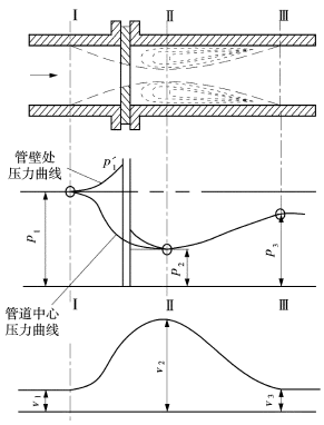 流體在管道截面I-I以前,以一定的速度流動(dòng),管內(nèi)靜壓力為p1。由于節(jié)流元件的孔徑小于管道內(nèi)徑,當(dāng)流體流經(jīng)節(jié)流元件時(shí),流體截面突然收縮,流速加快,靜壓降低。當(dāng)流體流過(guò)圓孔以后,由于慣性作用,流體截面繼續(xù)收縮一定距離,到流體截面最小處,流體截面最小處(圖2中Ⅱ-Ⅱ)稱為縮脈,流體在縮脈處的流速最高,動(dòng)能最大,靜壓最低。流體流過(guò)縮脈后,流體截面開(kāi)始逐漸擴(kuò)大,到管道截面Ⅲ-Ⅲ處,流體截面恢復(fù)到整個(gè)管道截面。