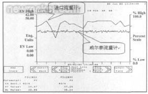 本文所提的解決方案先后成功應用于國內兩家煤化工企業(yè)。首先,該方案被應用于波動相對頻繁的豎管,橫管仍然采用原來的進口流量計。某企業(yè)因原進口流量計波動頻繁而引發(fā)跳車事故一年多達幾十次。由于威爾泰所提供的煤漿流量計平穩(wěn)性遠優(yōu)于其他同類產品,自投運以來,該企業(yè)從未因流量計波動而引起誤跳車。圖5所示為監(jiān)控系統(tǒng)工作站屏幕截圖所得的流量輸出平穩(wěn)性對比圖。由圖5可以看出,當位于橫管的進口流量計出現(xiàn)大幅度波動時,豎管威爾泰流量計輸出仍然保持平穩(wěn)。同時,工藝人員利用爐溫等其他參數進行綜合判斷,同樣證明了該豎管流量計輸出的穩(wěn)定性。