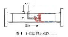 如圖1所示,V錐流量傳感器是由與管道同軸的內(nèi)部節(jié)流件V錐和取壓裝置組成的,流體經(jīng)過時(shí)并不是像孔板那樣突然改變流體的流動(dòng)狀態(tài),而是介質(zhì)隨著錐體的方向向邊壁收縮,該錐體起到了調(diào)整介質(zhì)流動(dòng)狀態(tài)的作用,重塑了流束曲線,使流體的流動(dòng)更加穩(wěn)定。而且由于慣性力的存在,介質(zhì)經(jīng)過V錐的邊緣時(shí)并不直接沖刷錐體邊緣,因此V錐的邊緣不像孔板那么容易磨損,V錐的使用壽命長。由于V錐特有的結(jié)構(gòu),V錐流量計(jì)有許多優(yōu)于孔板流量計(jì)的特點(diǎn)。