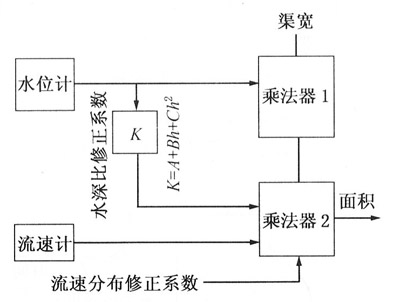 對(duì)矩形、梯形等斷面一定的明渠,利用水位測量可以求出水流的截面積。把壹臺(tái)或幾臺(tái)電磁流量計(jì)流速儀安裝在水路中,預(yù)先測量出流速儀得到的流速值和整個(gè)渠道的平均流速之間的流速分布修正系數(shù)及水深變化對(duì)流速的修正值。然后將渠寬、水深、平均流速修正系數(shù)和流速計(jì)所測量的流速值由計(jì)算機(jī)做乘法運(yùn)算即可求出流量,如下圖為測量的原理框圖。