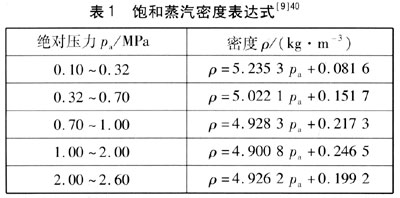 飽和蒸汽不同于理想氣體,不能通過氣體狀態(tài)方程來計算其密度;也不同于過熱蒸汽,不能用以溫度和壓力為自變量的近似公式來計算其密度;只能用以溫度或壓力為自變量的近似公式來計算其密度。以壓力為函數(shù)的飽和蒸汽密度表達式見表1,飽和蒸汽密度表達式在相應(yīng)的壓力范圍內(nèi)精度比較高。
