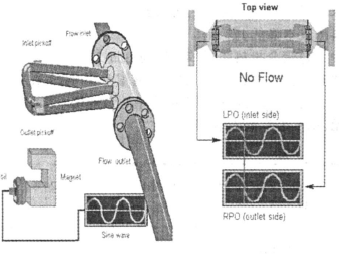 當(dāng)測量管中有流體流過時,雙U型振動管由于振動方向相反,在科里奧利里的作用下,產(chǎn)生如圖2所示的扭動,該扭動的角度大小與流過振動管中流體的質(zhì)量流量成正比,扭動的角度可以通過進(jìn)出口檢測線圈檢測出來的信號相位差測得,即質(zhì)量流量=流量計(jì)系數(shù)´相位差。