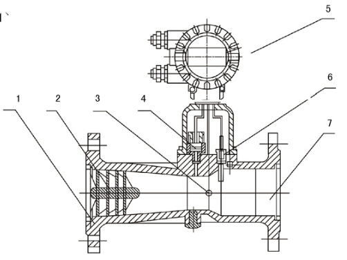 1、殼體2、旋渦發(fā)生體3、流量傳感器4、壓力傳感器5、流量積算儀6、溫度傳感器、7、導(dǎo)流體